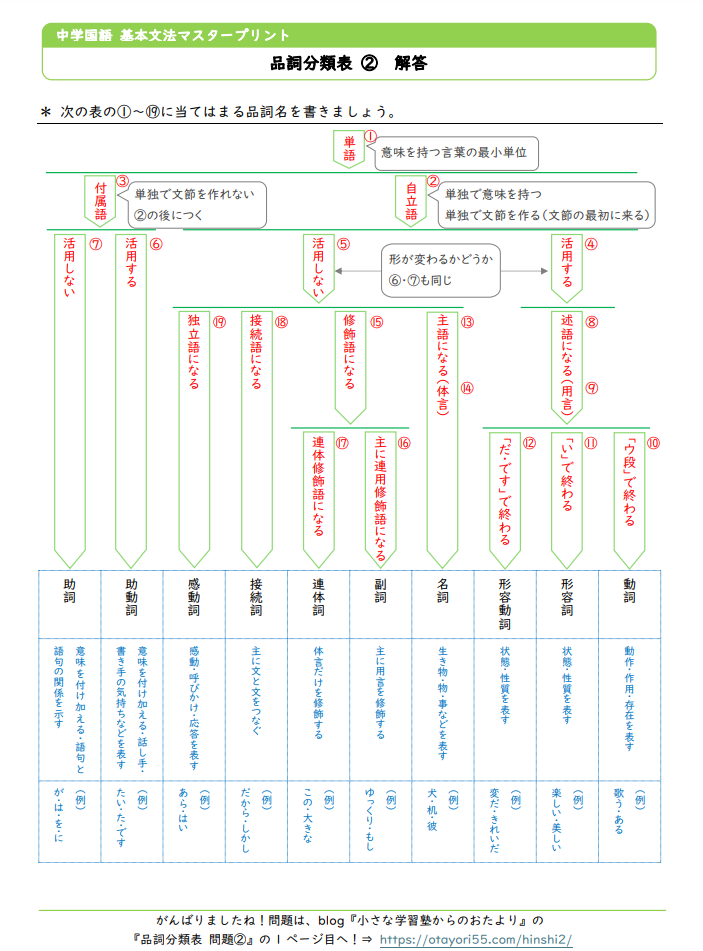 ⇒解答|中学国語文法【品詞分類表② 分類の仕方を覚える練習問題プリント】